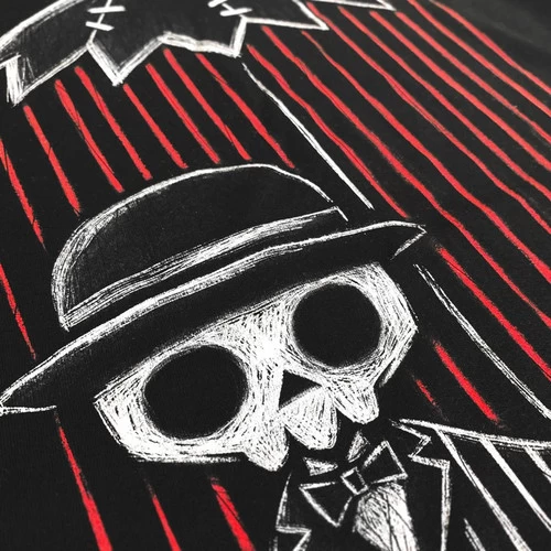 Original hand-drawn artwork of a dapper skeletal weathering his own personal storm.