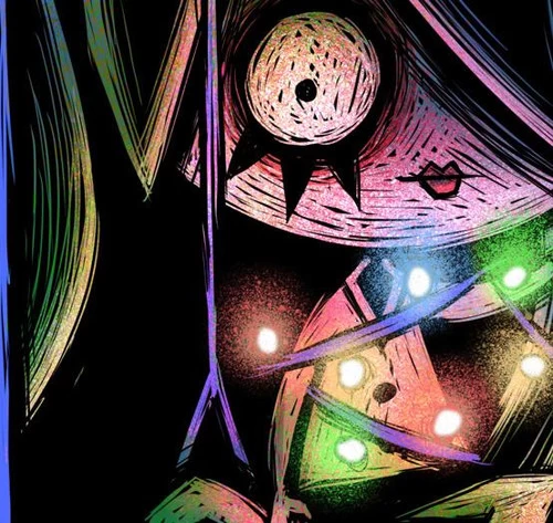 - Original hand-drawn artwork of a pair of unwholesome-looking twins, festively-lit by Christmas lights as they enjoy a nighttime swing in the playground with their favourite toys.