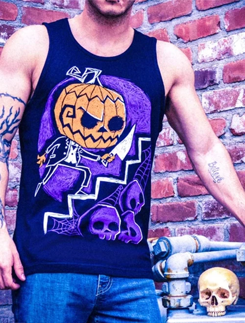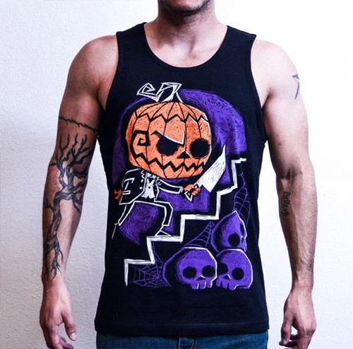 This sleeveless Akumu Ink tank top features hand-drawn artwork of a masked serial killer who, unbeknownst to him, wasn’t the first killer to pay a visit.