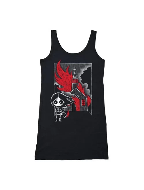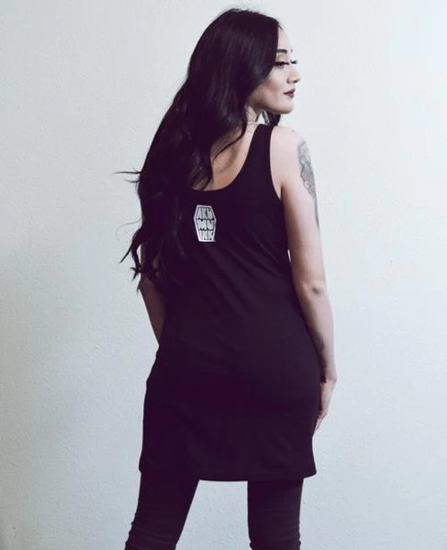 - Black ladies’ long tanktop featuring original hand-drawn artwork.