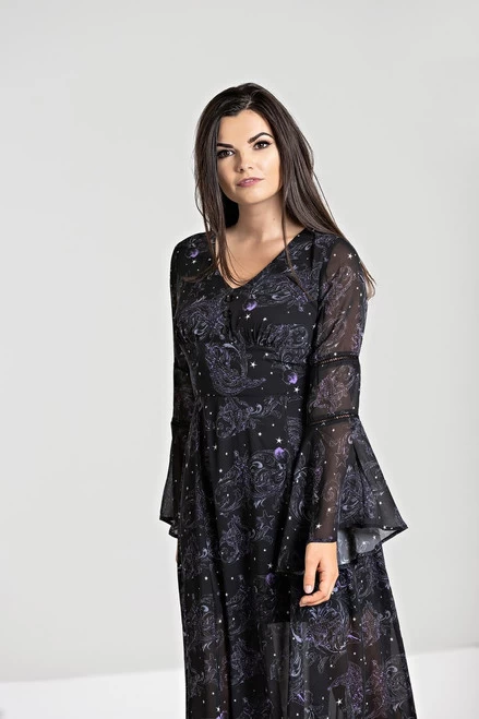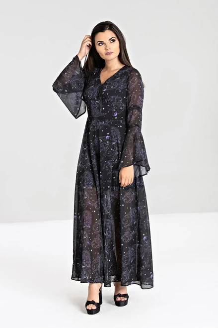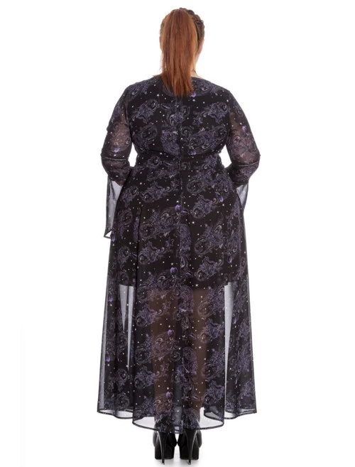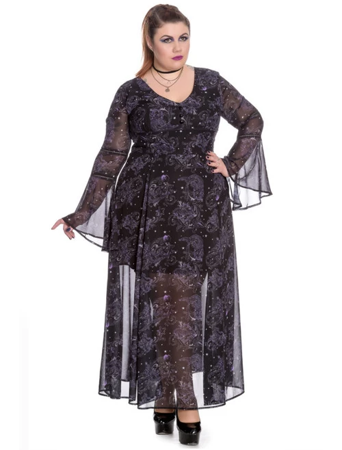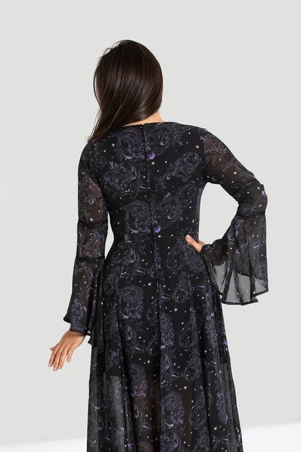 - Print is of siren skeletons, sea horses and sea shells on a filigree and star background.