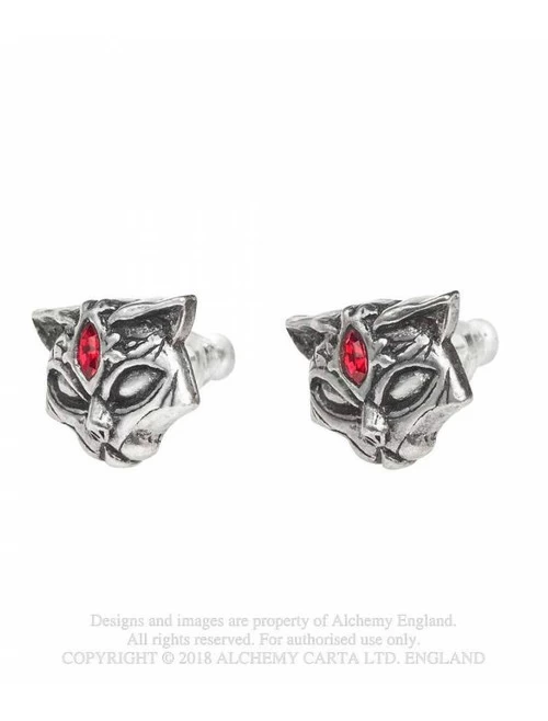- A pair of antiqued pewter cat’s heads ear studs with small red Swarovski elipse crystals upon their foreheads.