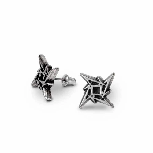 A pair of 3D sculpted ear studs based on the Metallica Ninja Star icon; English pewter earrings.