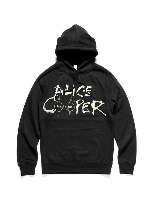 Black pullover hoodie featuring front kangaroo pouch pockets and the Alice Cooper “Eyes” design.