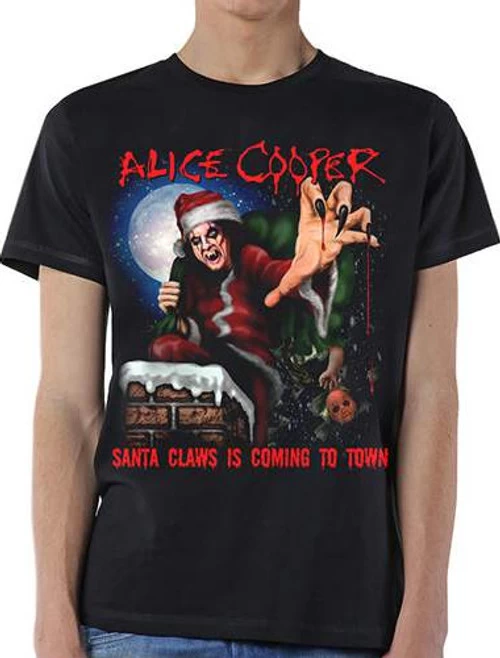You’d better watch out, cuz Santa Claws is coming to town! Black t-shirt featuring a front print of Alice Cooper as Santa Claws.