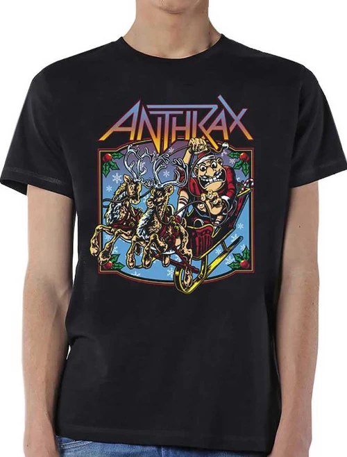 - Who says you can’t get in the Christmas spirit and still stay metal? This black unisex tee features a front print of the iconic “Anthrax” lettering, with a deranged Santa flying in his sleigh.