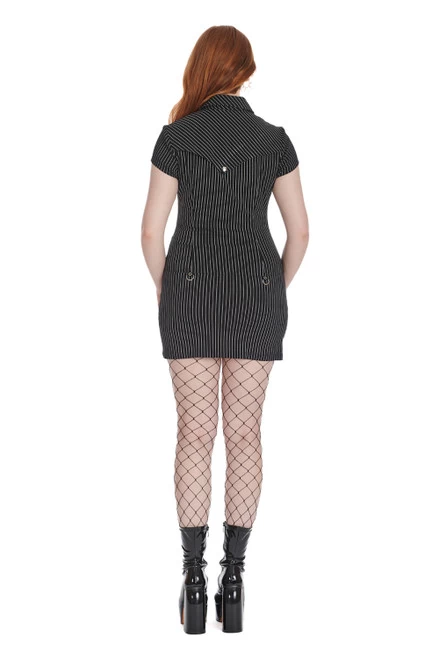 Black mini dress with white pinstripes. Made of stretchy bengaline material, it has a silver zipper front, faux breast pockets and black strap detailing. Top snap button can be worn open or closed.