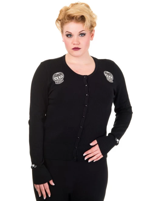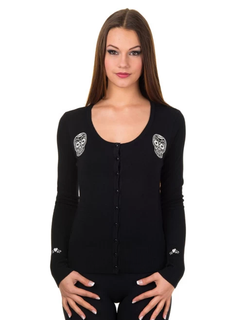 - Long-sleeved cardigan featuring white Mexican Day of the Dead-inspired embroidered skulls on the front, with small heart embroideries on the each sleeve.