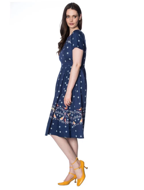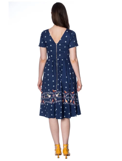 Elegantly drift into the spirit of the season in this stunning dress from Banned! Falling snowflakes on a dark blue background bring to mind a softly-snowing Christmas evening, with colourful birds perched on decorated bunting across the bottom hem and chest. The dress features short sleeves and a deep-V back, meeting with the almost full-length zipper which is presented in a shining silver as the final decoration.
