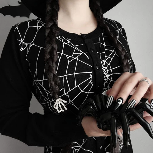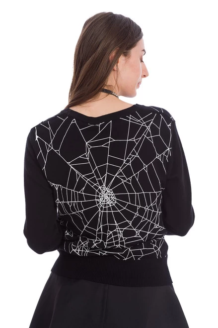 Black long sleeved cardigan with rubber print cobweb detailing on the front and back.
