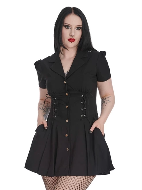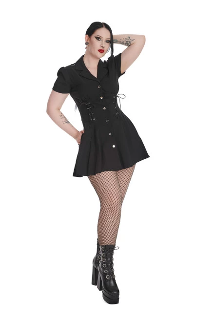Black button up mini dress with lace up embellishments and short sleeves, made of stretchy and breathable bengaline material.
