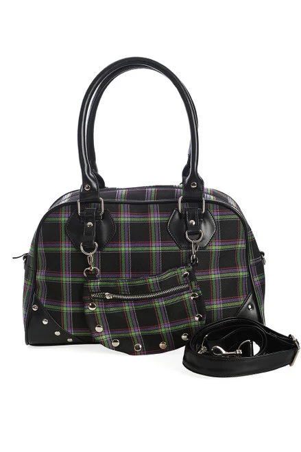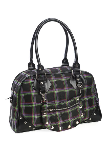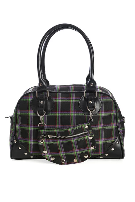 Black handbag with green, purple and red plaid pattern, detachable sporran style front pocket and shoulder straps. Comes with a detachable longer strap.