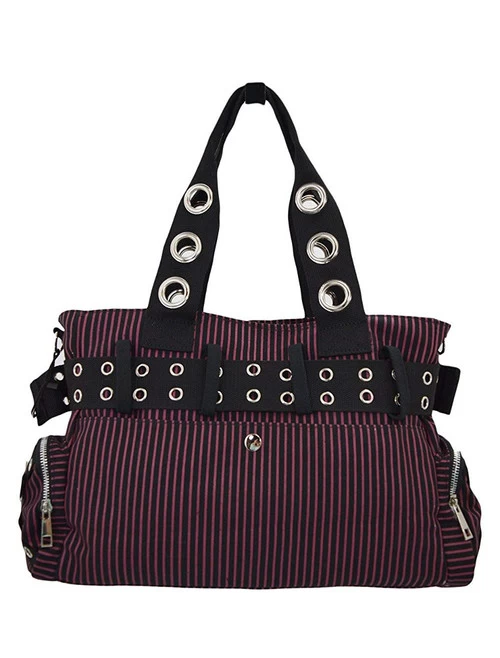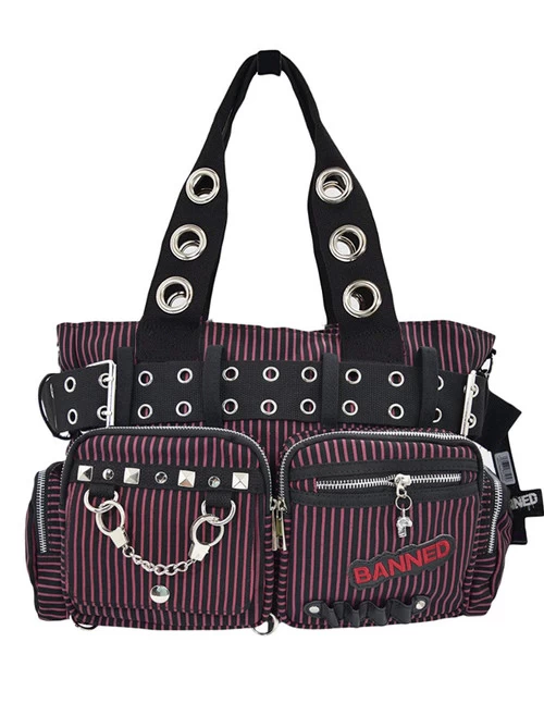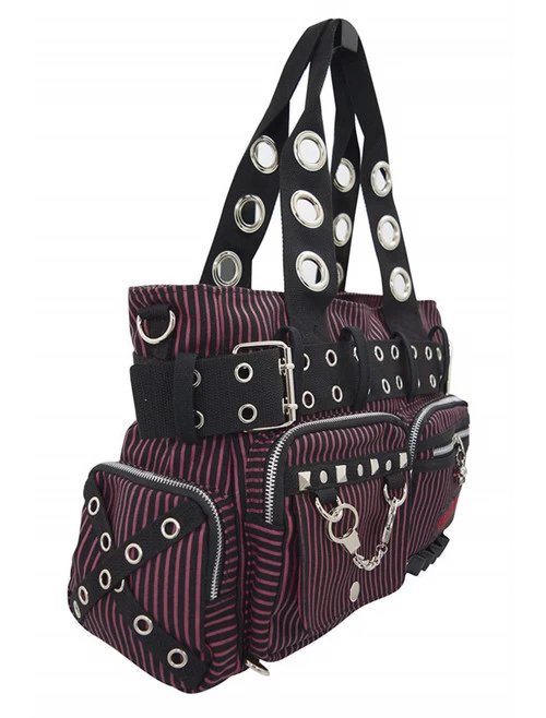 This stylish black and muted-red striped handcuff handbag has a perfect urban chic design that looks spectacular and unique. The bag has handcuff chain detailing and outer webbing straps with silver buckles. There are adjustable webbing shoulder straps that incorporate clip fastenings. The zip opening reveals an inner pocket, 2 side pockets and 2 front compartments that have zip up closures. This exclusively-designed bag is made from strong, durable canvas and is a brilliant example of urban street fashion.