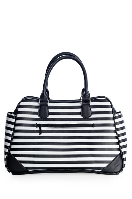 - Black and white striped handbag featuring a polyurethane patch of a gravestone with bat wings, inscripted with the words “I Just Wanna Give You The Creeps”