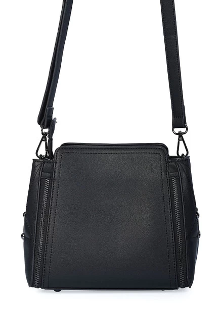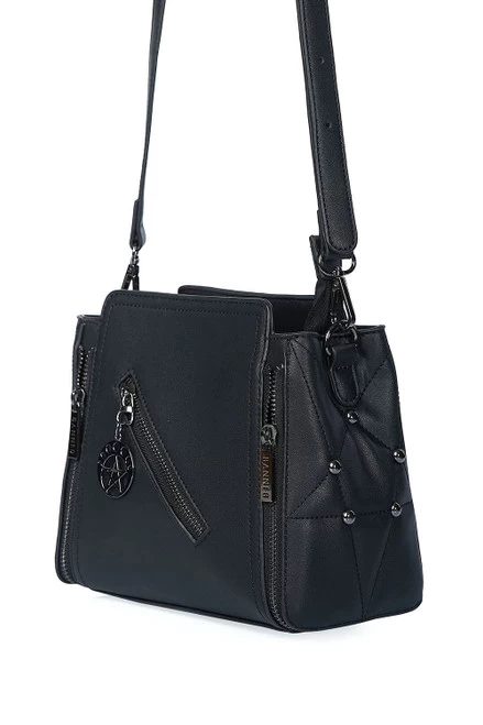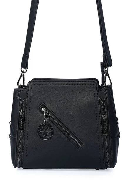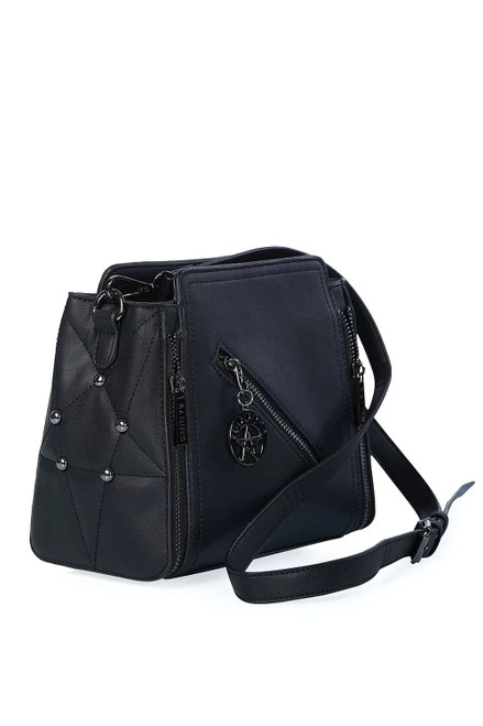 Black shoulder bag featuring pentagram detailing on the sides, embellished with silver studs, as well as a custom pentagram and moon phases zipper pull and detachable shoulder strap.