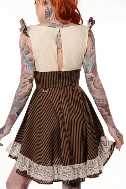 - Look no further for a stunning Steampunk design Retro dress with black and brown striped patterning and copper screws. The Retro Black Brown Striped Steampunk Dress also features brown faux leather and white lace frill details. This is a mini length dress and the front has copper key hole and key details. The skirt has lace strapping and there are white ribbon tie shoulder straps. Fastened with a zip at the back the dress is made from 100% Polyester. The main features of the Retro Brown Black Striped Steampunk Dress include: * Brown Black Striped Colour and Pattern * Steampunk Retro Dress * Mini Skirt * Copper Screws Detail * Brown Faux Leather and White Lace Detail * Copper Key Hole And Key