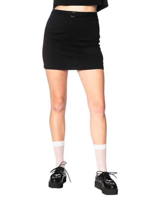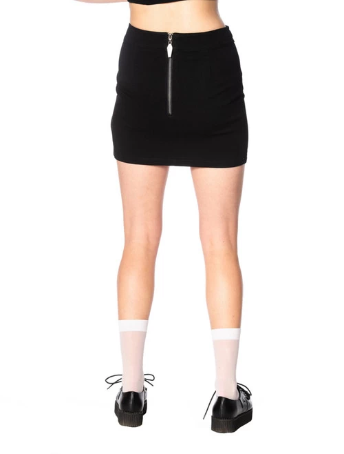 Black denim skirt featuring front O-ring decoration and a silver metal zipper at the back, with a custom coffin-shaped zipper pull.