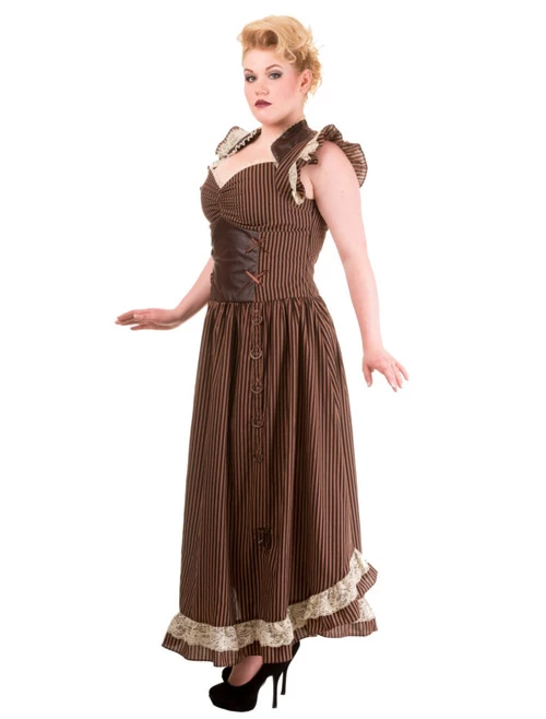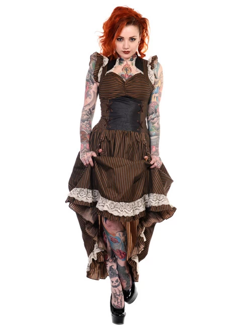 An unrivalled example of Steampunk fashion, this dress is designed with a brown/black striped pattern and has faux leather and white lace detailing. The dress is long and the top is styled like a corset. The skirt has a lace strap and D-ring buckles which lift it up at the front. There is a zip fastening at the back and the dress is made from polyester.