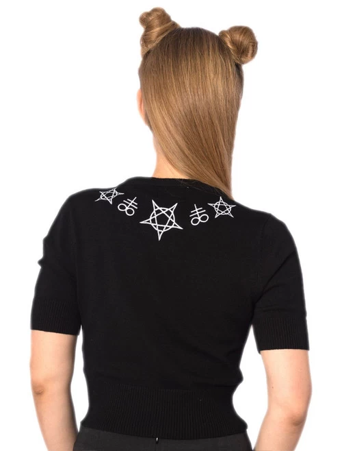 Black cropped, short-sleeved cardigan featuring embroidery of mystical symbols around the collar and a peephole at the bust.