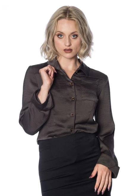 - Dark grey sateen blouse with dark copper buttons and pocket on left chest. Perfect for work!