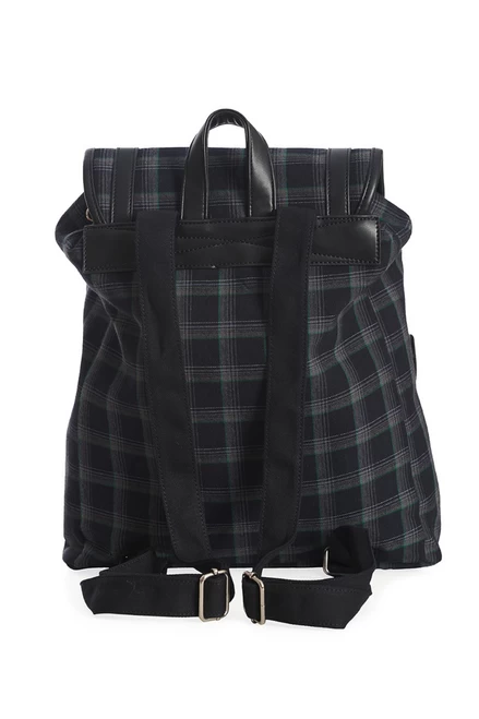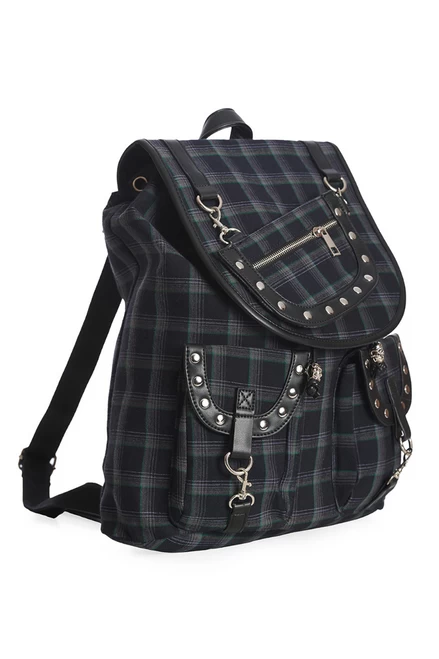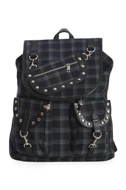 Grey check backpack with green stripes throughout. Features 2 front pockets, mini sporran, and Banned Alternative’s signature silver skulls.
