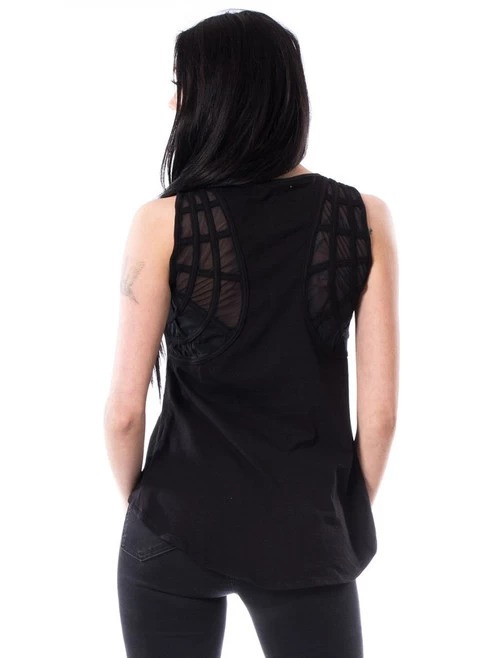 - Black ladies’ top featuring mesh accents at the bust and back.