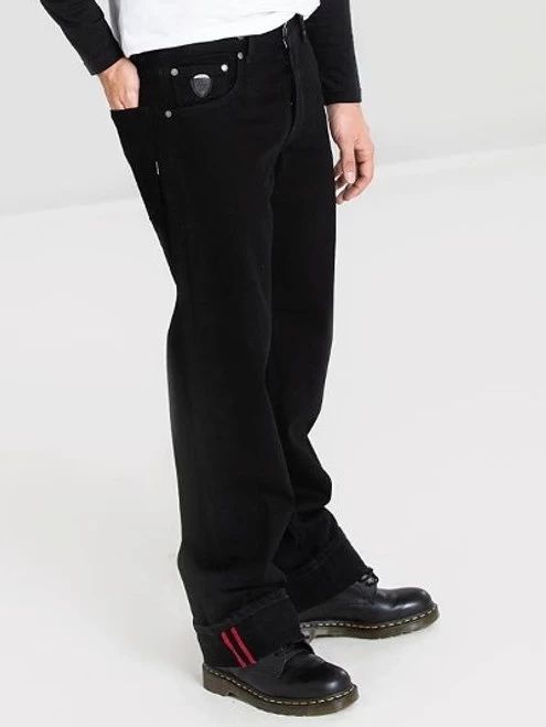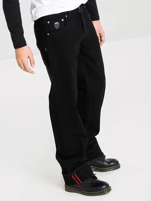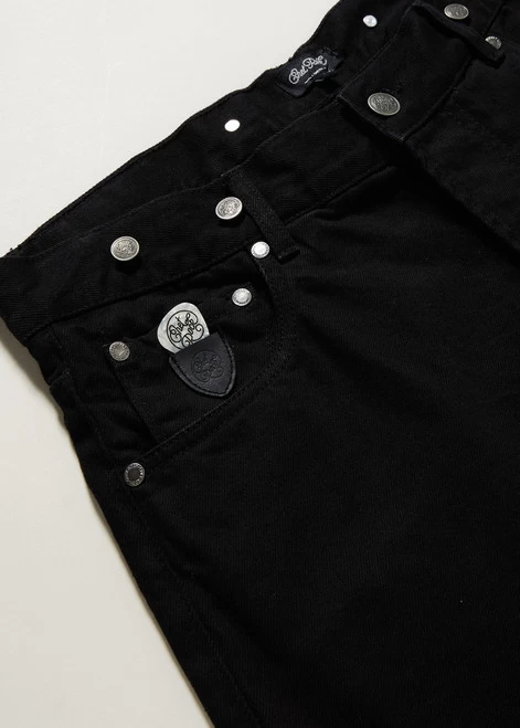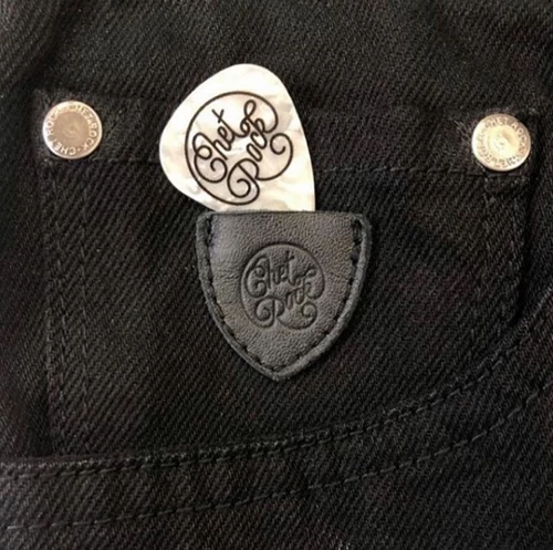 Super comfy black jeans featuring button and buckle embellishments as well as red stitching that shows when the bottom cuff is folded up. Not enough? Well, it also comes with an ivory-look, Chet Rock-branded guitar pick with a purpose-made pocket to keep it in!