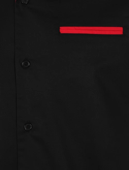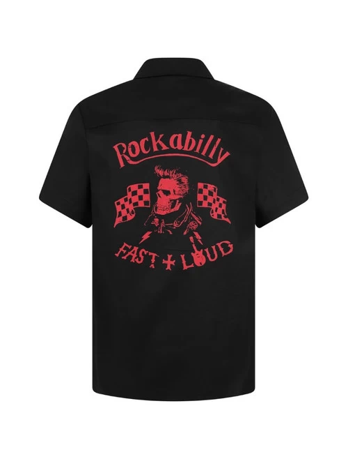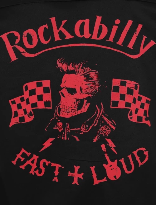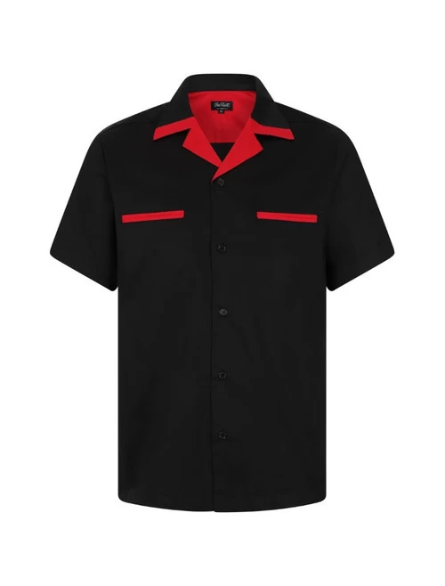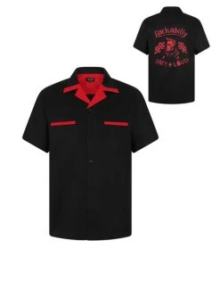 - This black button up bowling shirt features red trim detailing on the front pocket and collar, with a red Rockabilly print on the back.