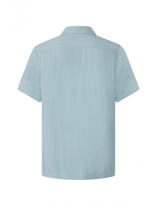 - Light blue viscose shirt with short sleeves and a chest pocket with contrasting white lines.