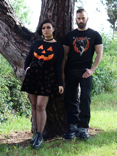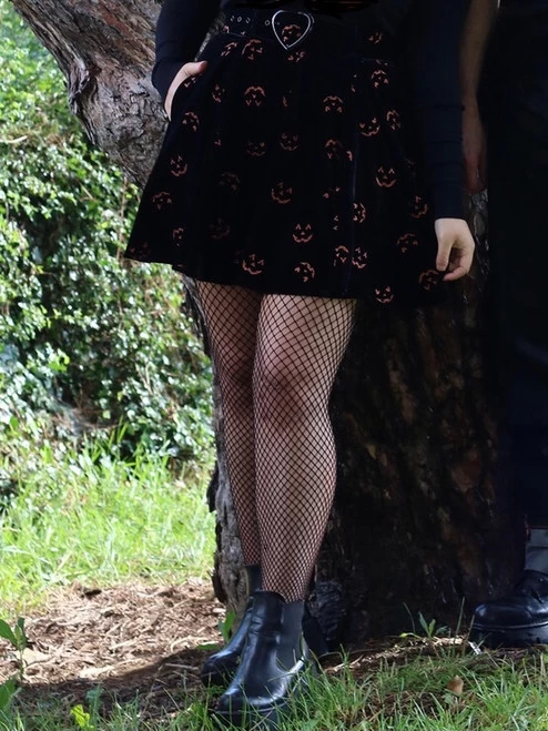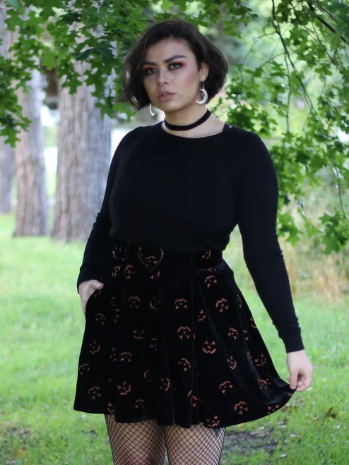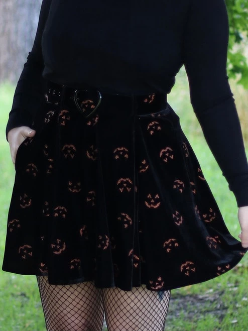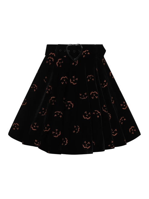 What better name could we have chosen for this adore-able Adore Pumpkin Glitter Skater Skirt? This flippy velvet mini-swing has an all-over bespoke orange glitter print of Jack-O-Lantern face cutouts, complete with a matching belt with a shiny heart buckle. Adore has us loving Halloween all year round!