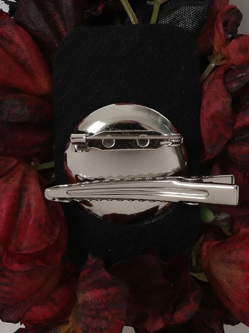 This stunning style is our Petra Hair Flower! It’s a sombre mix of dark red fabric petals with a large black flower, with white flowers sprinkled throughout. It can be clipped into your hair via a metal clip, or pinned to your jacket via a safety pin. Giving us some Halloween vibes, try yours with our Amber-Lea Haunted House Swing Dress!