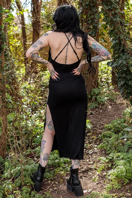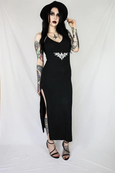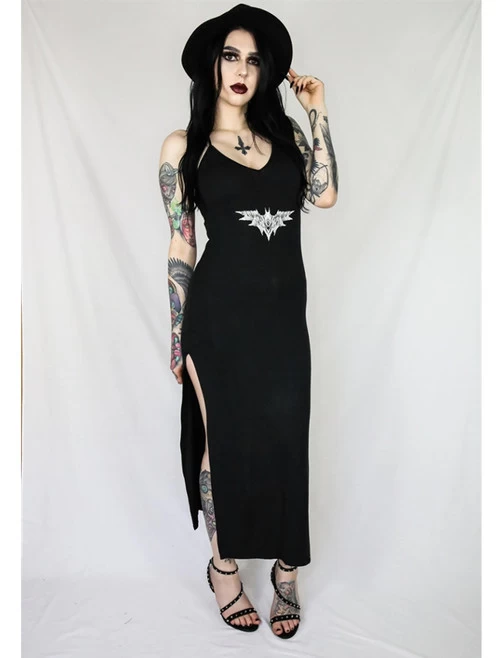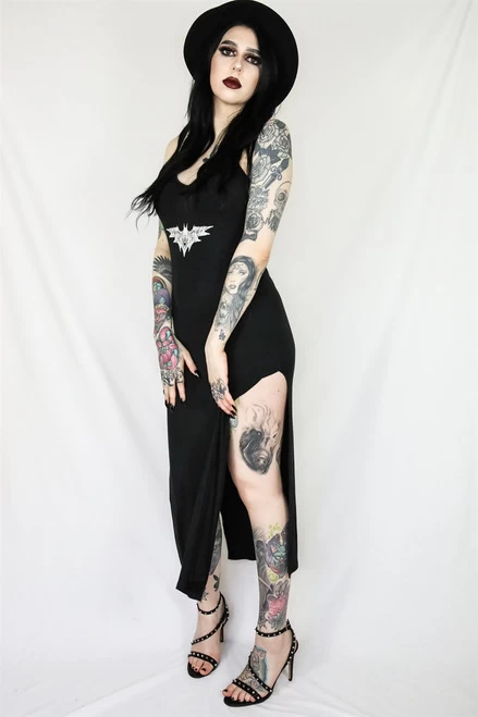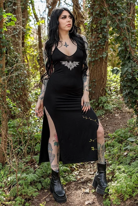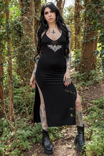 Halloween every day, we say! Unleash your inner Morticia with our beautiful Bat Maxi Dress, who says Summer can’t be goth? This black fitted maxi dress features a white bat print below a plunging neckline, with halter straps that cross over the open back. The side splits were made for showing off your tan and / or tatts! Team with a wide brimmed hat, cat eye sunglasses and platforms for an edgy look.