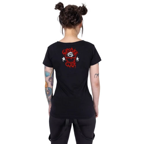 Black women’s fit t-shirt featuring a front print of a black haired Alice In Wonderland with the Cheshire Cat and White Rabbit. The back features a print of the Cupcake Cult logo in red and white.