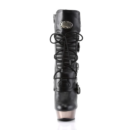 5 1/2″ (14cm) Finger Bone Heel, 1 1/2″ (3.8cm) Platform Lace Up Calf High Boot Featuring Skull Buckle Straps, Side Zip.