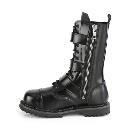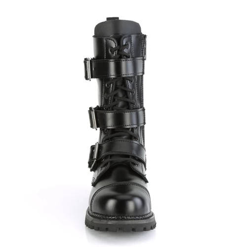 12 eyelet unisex leather ankle boots, featuring steel toe, lace-up front, triple buckle accents, rubber sole and full-length inside zip closure.
