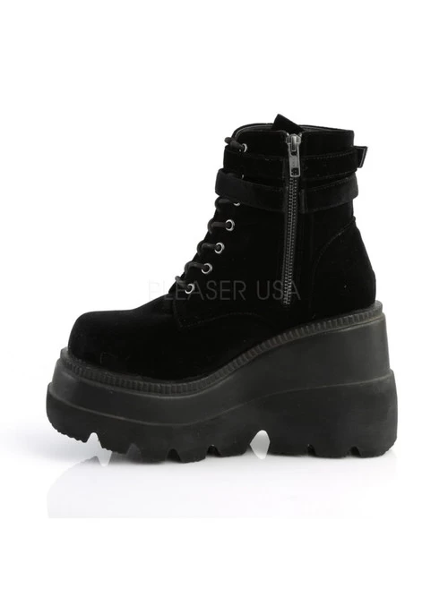 Every dark-side gal needs a pair of velvet boots, and here they are! These elegantly-chunky ankle boots features a double strap across the ankle and a 4 1/2 inch platform wedge, with an inside zipper for quick wearin’.