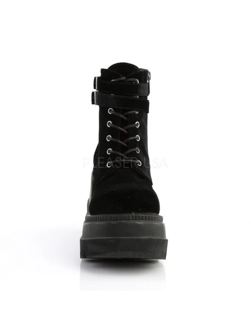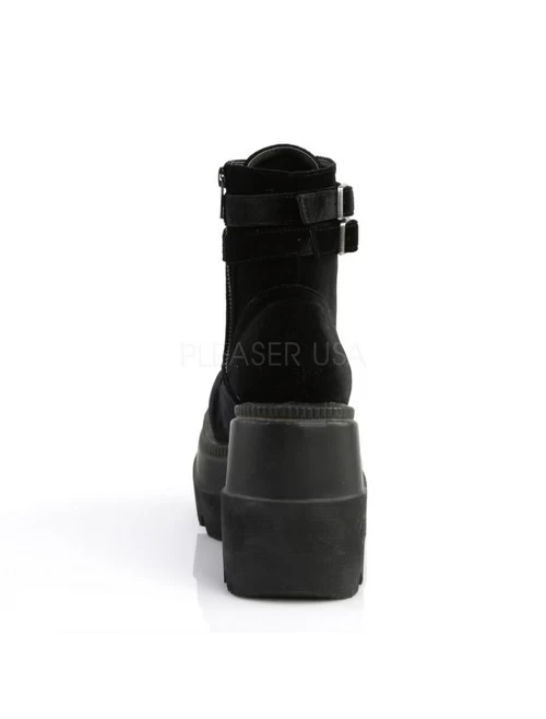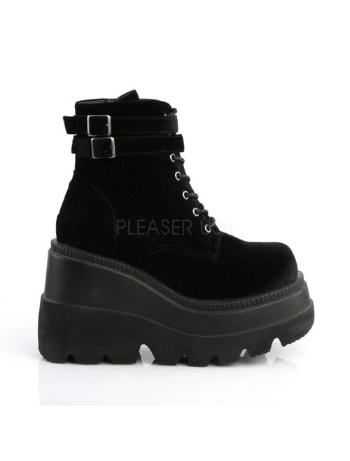 Every dark-side gal needs a pair of velvet boots, and here they are! These elegantly-chunky ankle boots features a double strap across the ankle and a 4 1/2 inch platform wedge, with an inside zipper for quick wearin’.