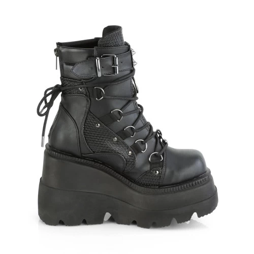 4 1/2″ (114mm) Wedge Platform Lace-Up Dual Buckle Ankle Boot Featuring Studded Contrast Panels & Pewter Tone Hardware On Front Center Vamp That Includes Horseshoe Ring , Spike Studded Metal Plate and Large O-Ring, Metal Back Zip Closure