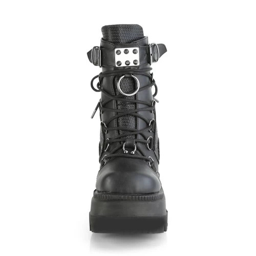 A spiked metal plate, horseshoe barbell embellishment, rings and mesh-look materials give the Pierced Shaker boots a mix of goth, metal and cyber flavours. The top double-strap with the metal spike plate and O-ring is removable, and there is a full back zipper for easy on / off. The wedge platform sole is 4 1/2″ high and the whole boots features a curvy contrast panel design.