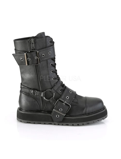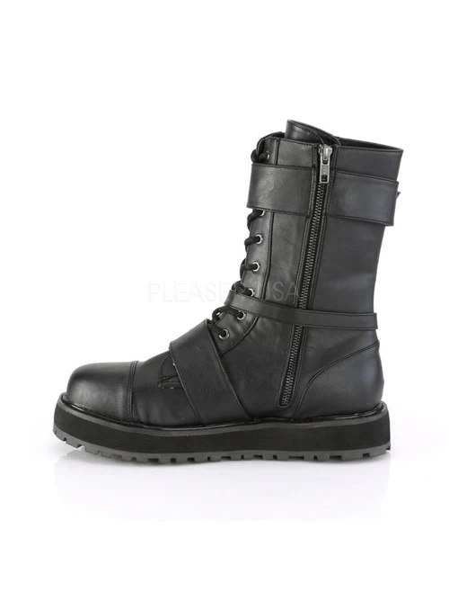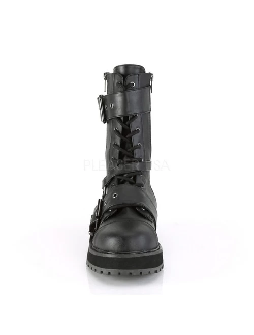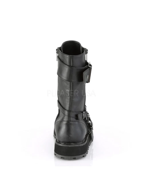 The Valor-220 boots from Demonia combine the best aesthetics of combat and motorcycle boots, with a touch of heavy metal flair. They feature a 1 1/2″ (38 mm) platform, an O-ring-centred harness strap, buckle straps at the calf and top of the foot and, last but not least, an ornamental silver-grey metal zipper down the outside.