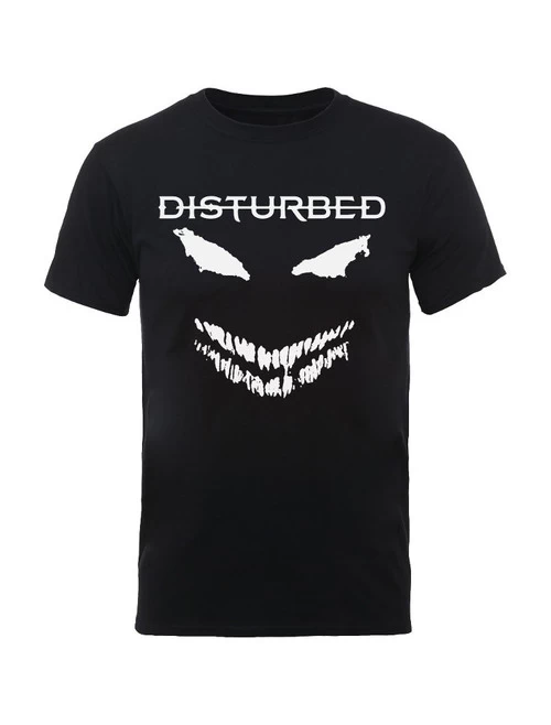 Black t-shirt featuring a white print of the iconic Disturbed face in a jack-o’-lantern style.