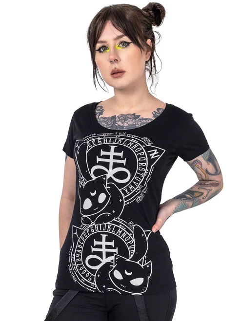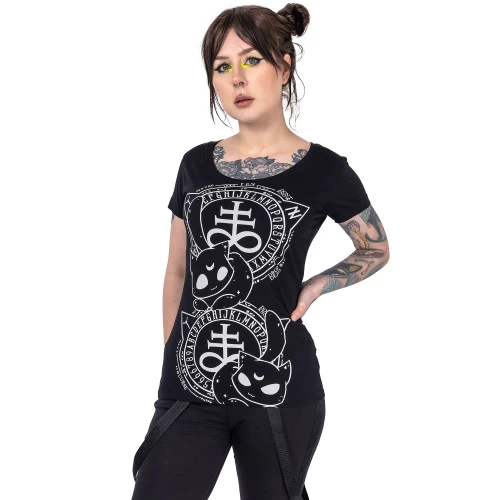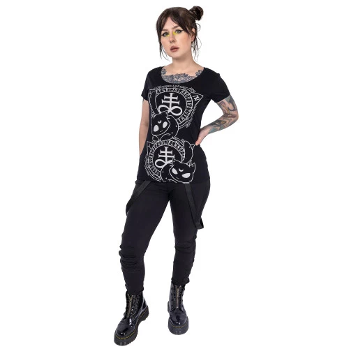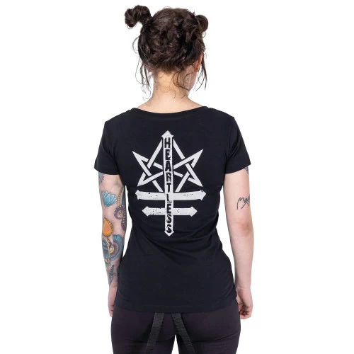 Black round neck ladies’ fit tee with white print. Heartless symbol on the back.