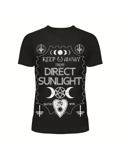 - Black ladies’-fit t-shirt featuring a front print advising that the wearer be kept away from direct sunlight.