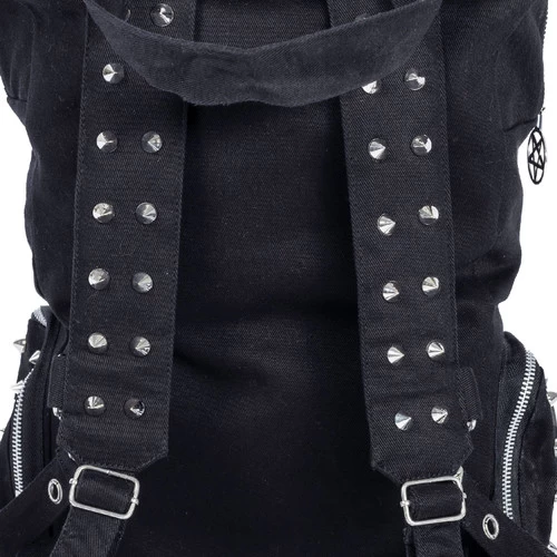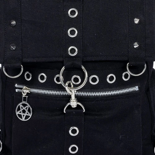 There are silver spikes on the straps, side pockets and on either side of the front flap (don’t touch my bag!). There are eyelets, o-rings, silver zips and pentagram charms. All the things to make your dark heart happy!