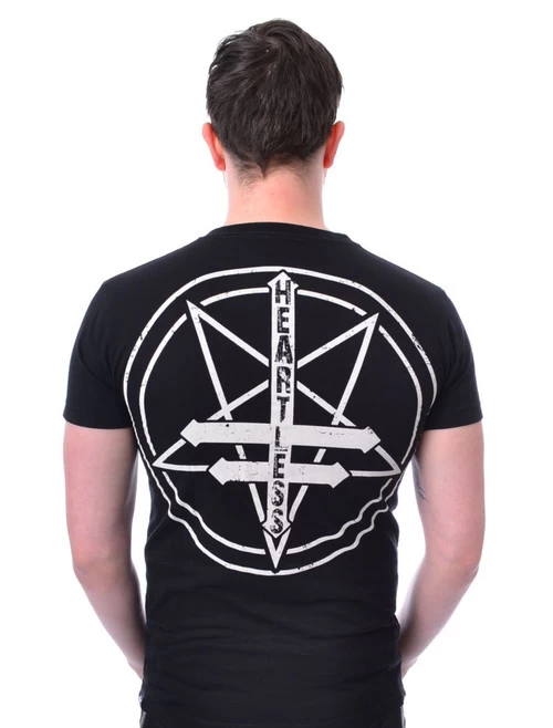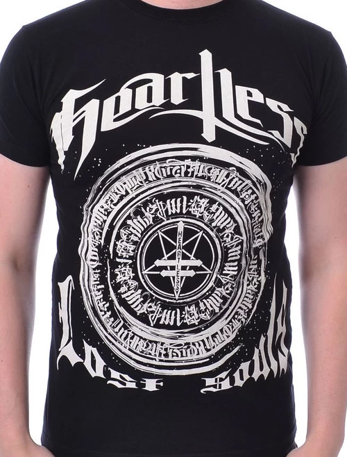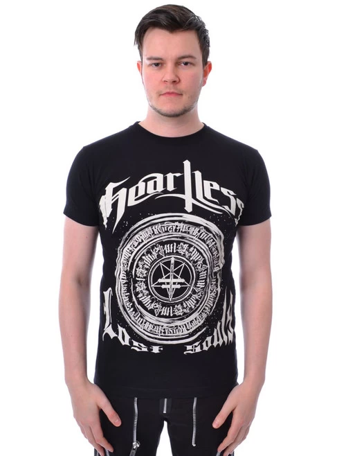 Black unisex tee featuring front print of pentagrams, crosses and “Lost Souls” design. Heartless symbol on the back.