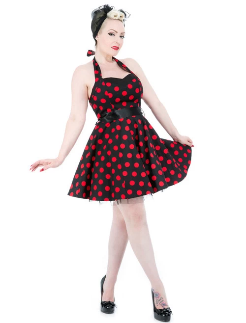 - Too hot to trot in H&R’s beautiful black and red polka dots mini dress! A gorgeous black dress with large red polka dots, thisclassy little number has a sweetheart neckline with halter straps that tie in back of the neck. It also features a side zipper, black sash at waist, and black crinoline peeking out from the bottom.