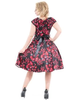 The 50’s rockabilly style Red Rose Day Dress by Hearts & Roses is an all year round style which complements a summer wardrobe style or an autumn winter style. The print consists of gorgeous red roses on a black stretchy cotton material. To add a sleek edge, a black satin sash is added which nips in at the waist. The cut of the bodice is fitted which flares into a swing skirt, giving you a sophisticated retro vintage look.