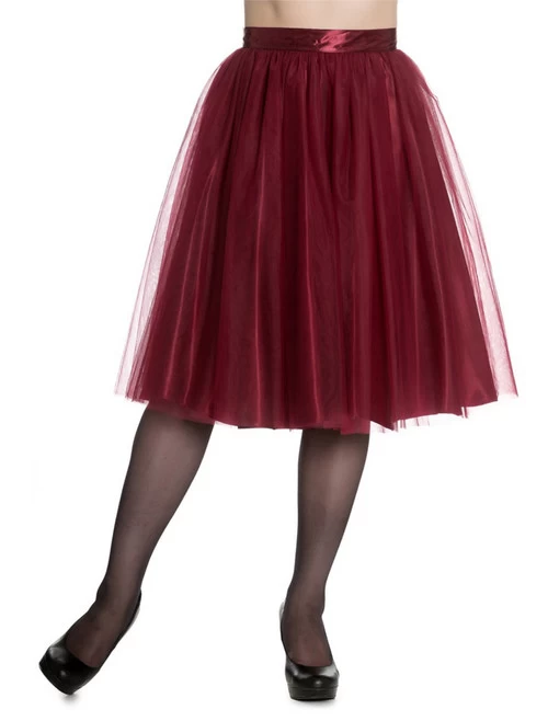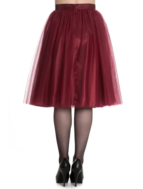 - Satin-lined burgundy tulle ballerina-style skirt.