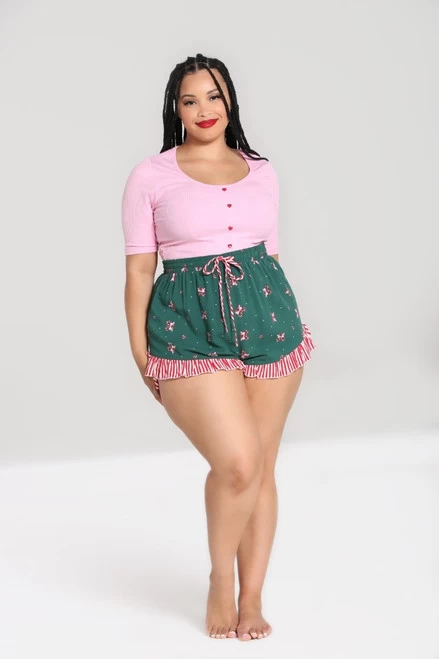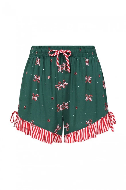 - Contrasting red & white striped waist tie and decorative frilled hem
