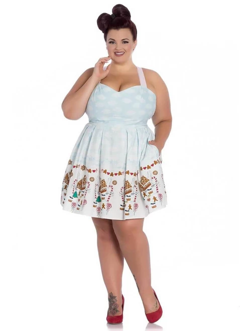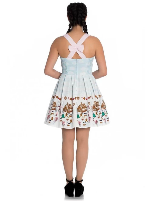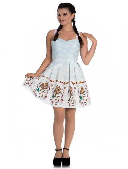 - Print consists of gingerbread houses, gingerbread men, sugar canes, Christmas cakes, gingerbread men and red hearts on a red string, and mountains and clouds on a pastel blue background.